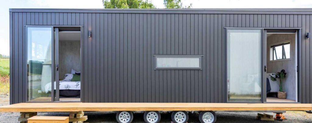Mobile homes are abodes manufactured as box trailers. They are made in NZ factories in two weeks, cost about 10% the price of a basic home. They are towed onto site and set up in 2 hours and they do not commit land like a building. They are an immediate, low-cost adequate housing solution.