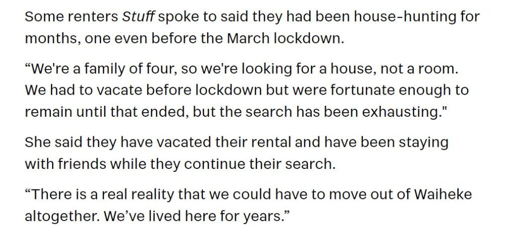 Gentrification: As the island attracts home buyers competing for 2nd holiday homes, and landlords converting rental units into Airbnb visitor accommodation, the community becomes hollowed out by hollow homes. The young, born and raised on Waiheke cannot afford to rent or buy, thus they are forced to leave the community they call home – gentrified off. Older people and pensioners, especially women on their own who have rented on Waiheke for decades are evicted by landlords or sales, where they have to place their belongings in storage as they move from one short-term lease to another… until those dry up and they are forced to leave Waiheke or join the ranks of the hidden homeless.