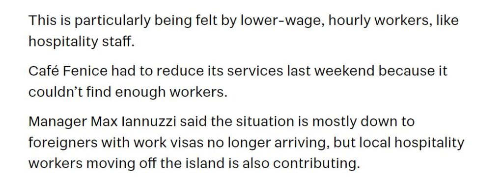 Staffing: And then there is the business problem. The working holiday visa has provided the staffing for the restaurants, vineyards, farms and visitor industries, but the first question an employer asks the job applicant is do you have a place to live? This is a severe problem because there simply are not enough bedrooms. Wealthier businesses are buying homes for their staff, while others cut back on hours or go out of business.
